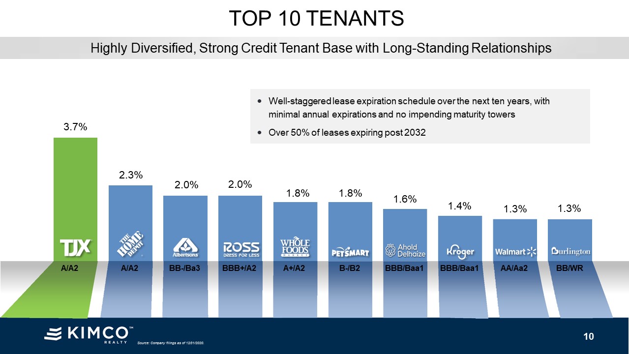 of 12/31/2020. TOP 10 TENANTS 3.7% 2.3% 2.0% 2.0% 1.8% 1.8% 1.6% 1.4% 1.3% 1.3% A/A2 A/A2 BB-/Ba3 BBB+/A2 A+/A2 B-/B2 BBB/Baa1 BBB/Baa1 AA/Aa2 BB/WR Well-staggered lease expiration schedule over the next ten
