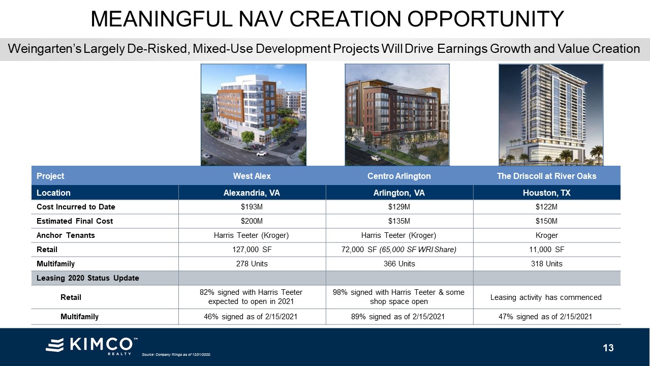 Creation MEANINGFUL NAV CREATION OPPORTUNITY Source: Company filings as of 12/31/2020. Project West Alex Centro Arlington The Driscoll at River Oaks Location Alexandria, VA Arlington, VA Houston,