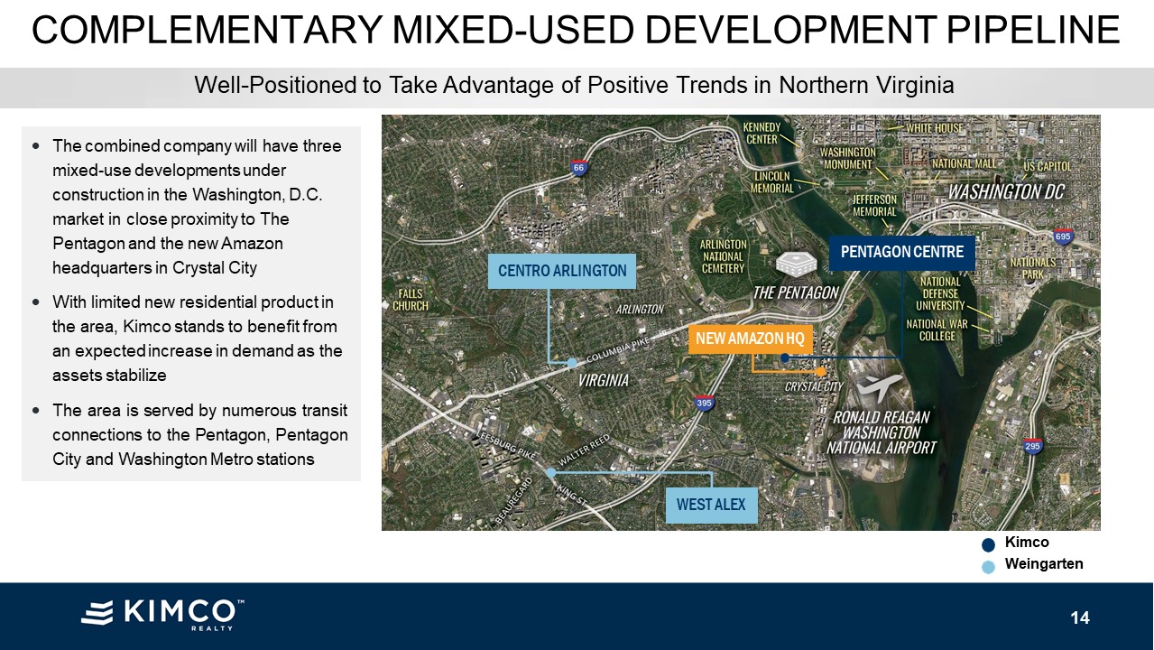 COMPLEMENTARY MIXED-USED DEVELOPMENT PIPELINE PENTAGON CENTRE Kimco Weingarten The combined company