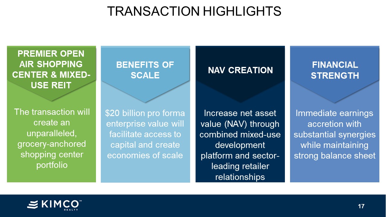 value of ~$20 billion is greater than other public shopping center REITs and establishes Kimco as a clear leader in the sector Enhances liquidity and access to capitalImproves margins and G&A rationalized over larger asset baseCombined