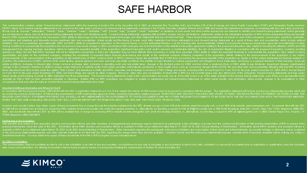 Investor Presentation KIMCO AND WEINGARTENSTRATEGIC MERGER APRIL 2021 Creates Premier Open-Air
