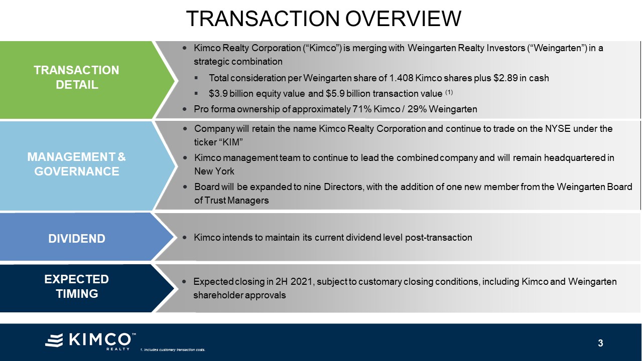 Corporation (“Kimco”) is merging with Weingarten Realty Investors (“Weingarten”) in a strategic combination Total consideration per Weingarten share of 1.408 Kimco shares plus $2.89 in cash$3.9 billion equity value and $5.9 billion transaction