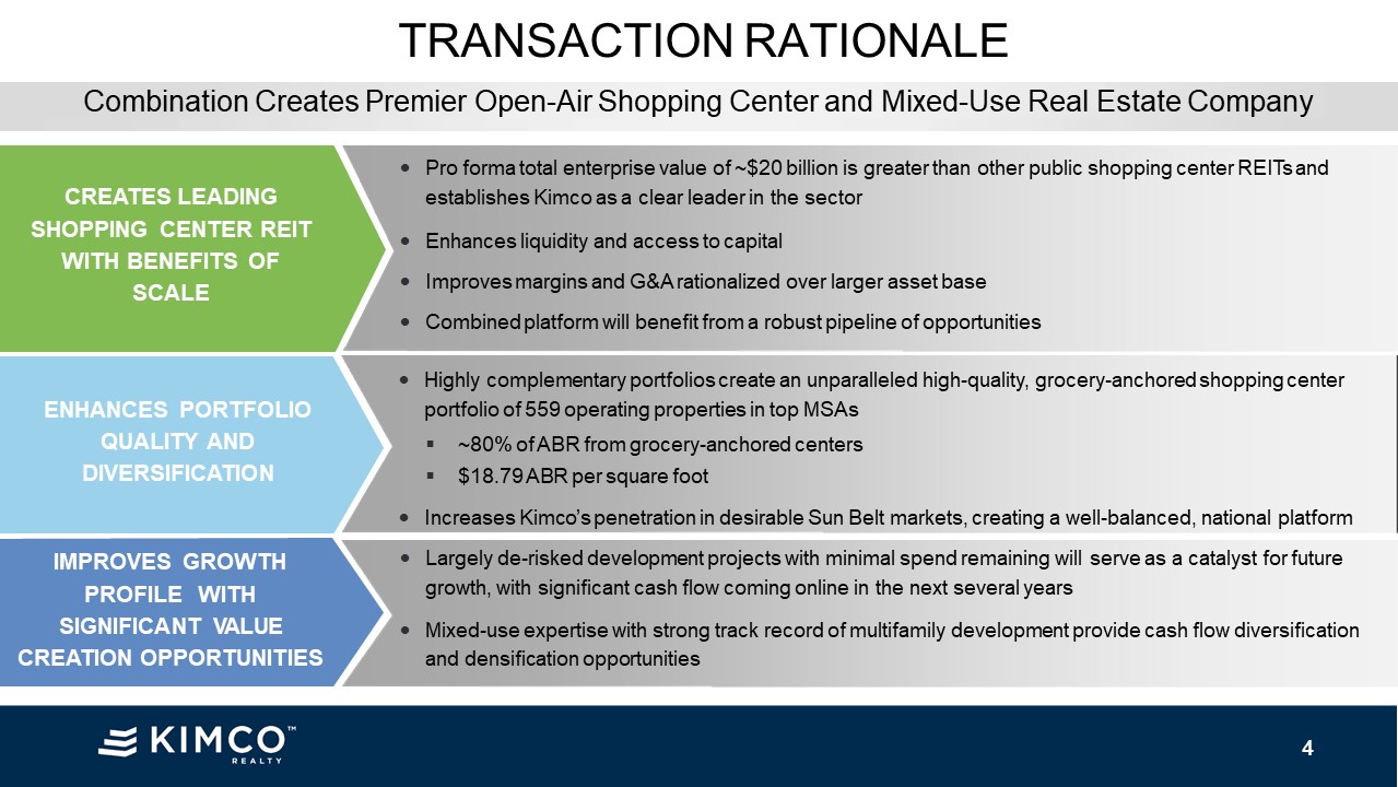current dividend level post-transaction EXPECTEDTIMING Expected closing in 2H 2021, subject to customary closing conditions, including Kimco and Weingarten shareholder approvals 3