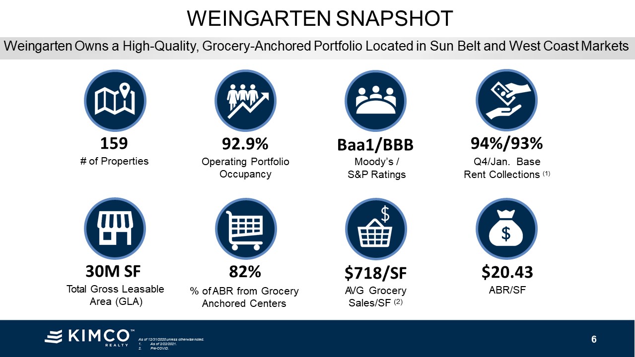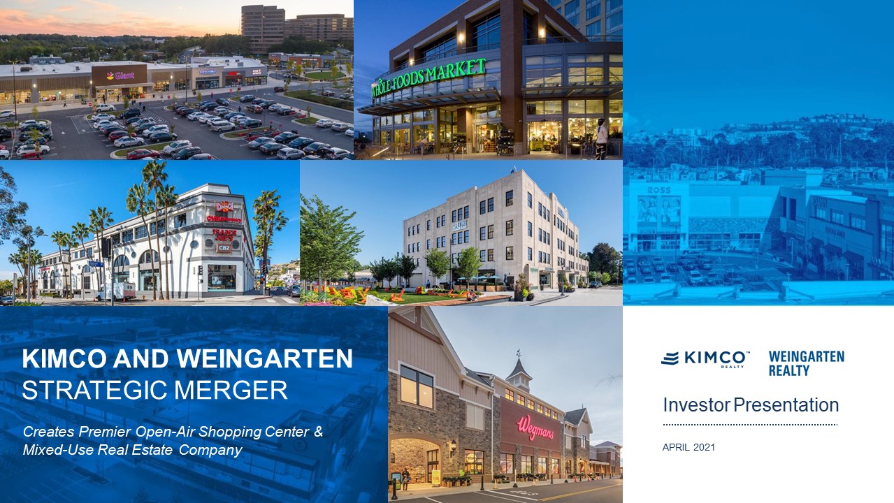 (“Kimco”) is merging with Weingarten Realty Investors (“Weingarten”) in a strategic combination Total consideration per Weingarten share of 1.408 Kimco shares plus $2.89 in cash$3.9 billion equity value and $5.9 billion transaction value