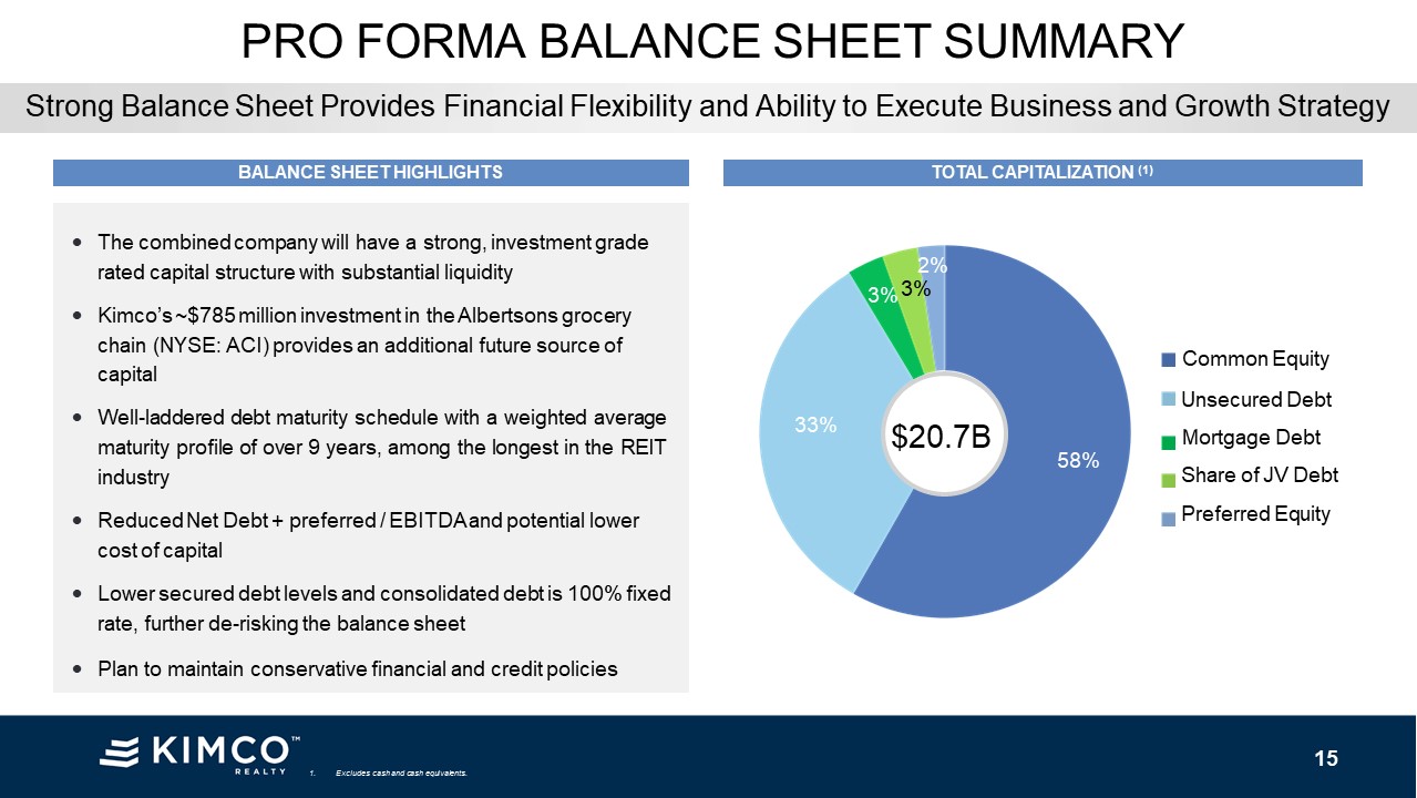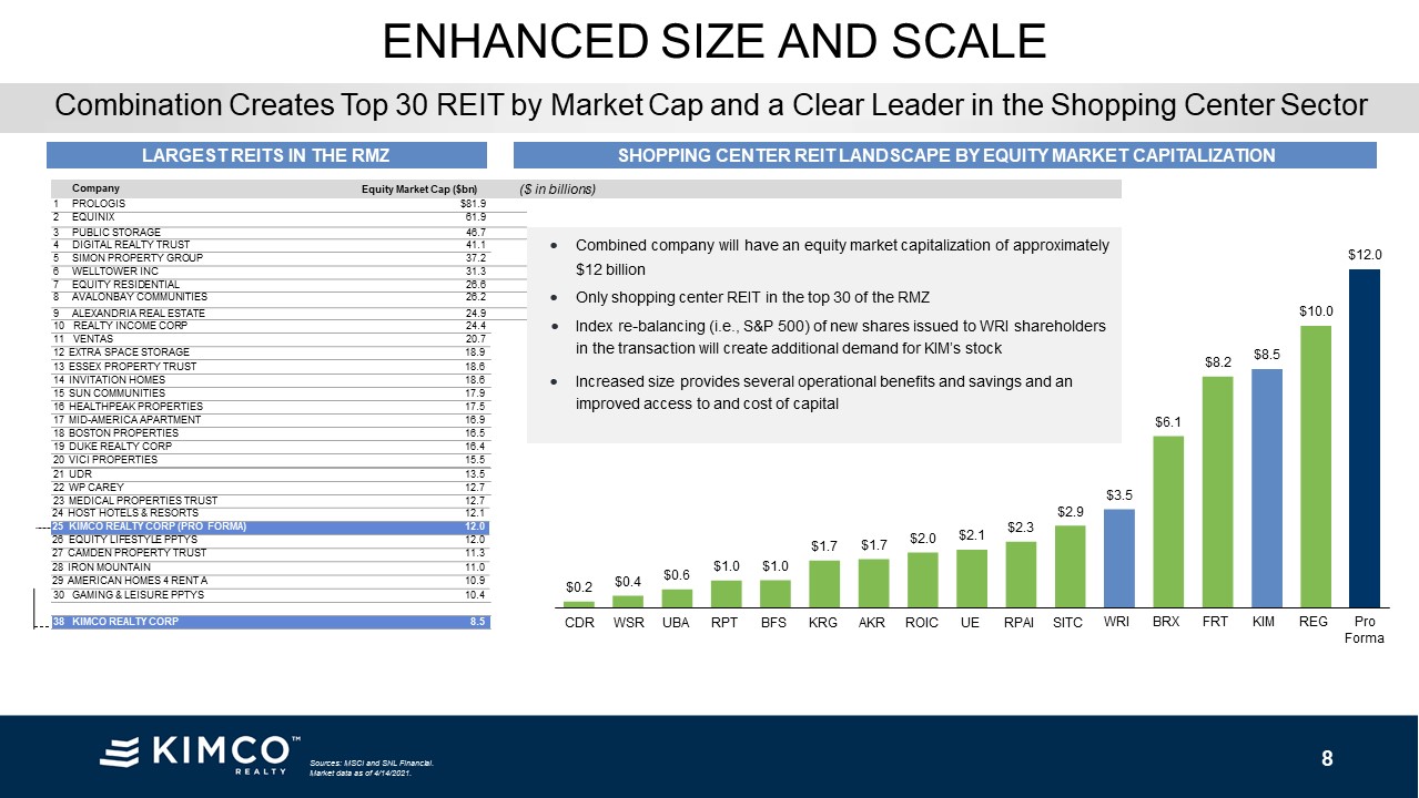 enterprise value of ~$20 billion is greater than other public shopping center REITs and establishes Kimco as a clear leader in the sector Enhances liquidity and access to capitalImproves margins and G&A rationalized over larger asset