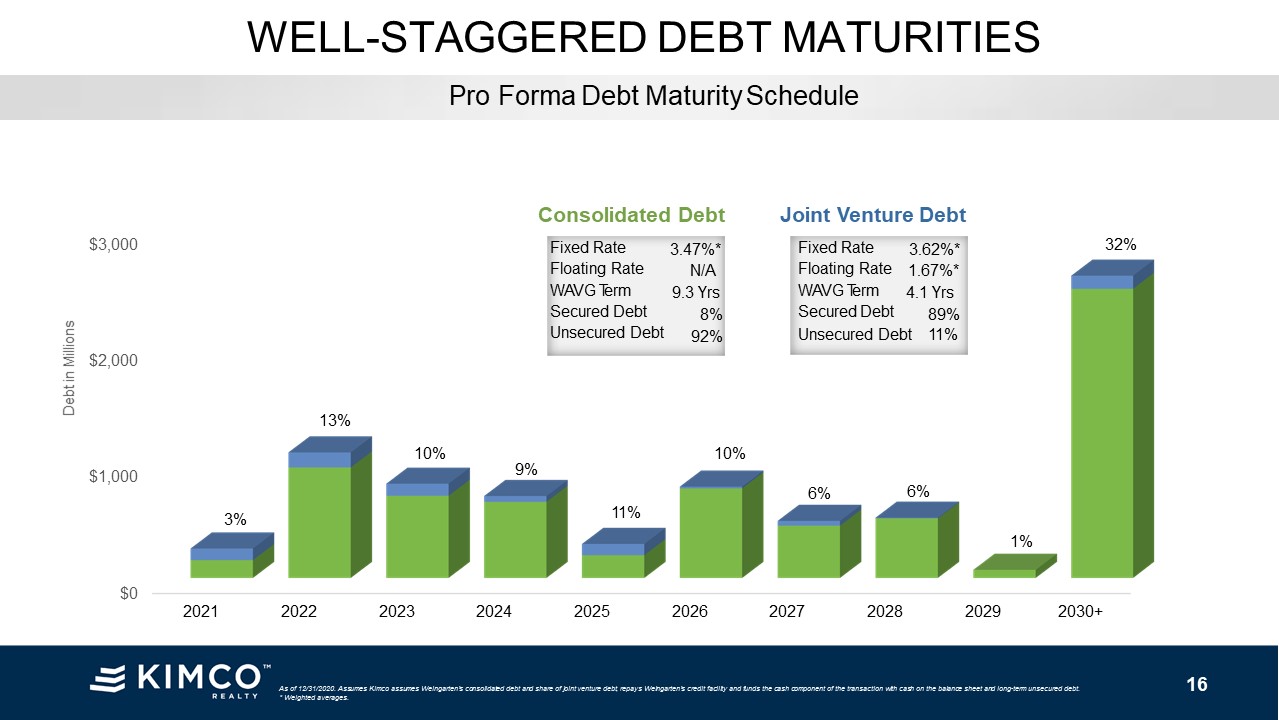 Debt 3.62%*1.67%*4.1 Yrs89% Unsecured Debt 11% Fixed Rate Floating Rate WAVG Term Secured Debt Unsecured Debt 3.47%*N/A9.3 Yrs8%92% 32% As of 12/31/2020. Assumes Kimco assumes Weingarten’s consolidated debt and share of joint venture