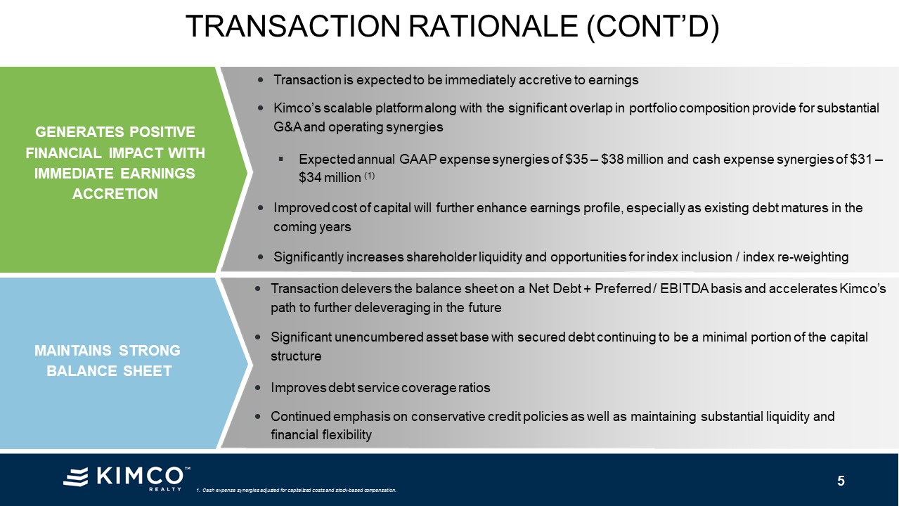 compensation. GENERATES POSITIVE FINANCIAL IMPACT WITH IMMEDIATE EARNINGS ACCRETION Transaction is expected to be immediately accretive to earnings Kimco’s scalable platform along with the significant overlap in portfolio composition