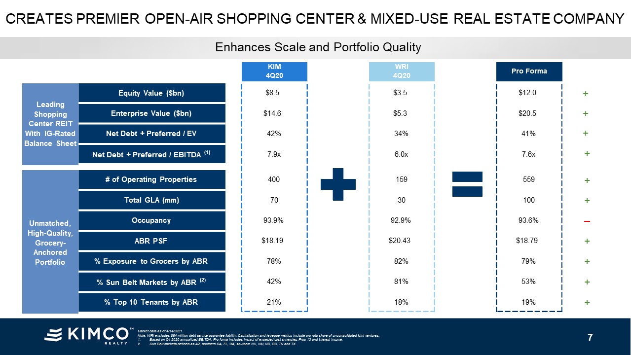 ABR 21% 18% 19% Unmatched, High-Quality, Grocery- Anchored Portfolio Leading Shopping Center REIT With IG-Rated Balance Sheet Enhances Scale and Portfolio Quality Market data as of 4/14/2021.Note: WRI excludes $54 million debt