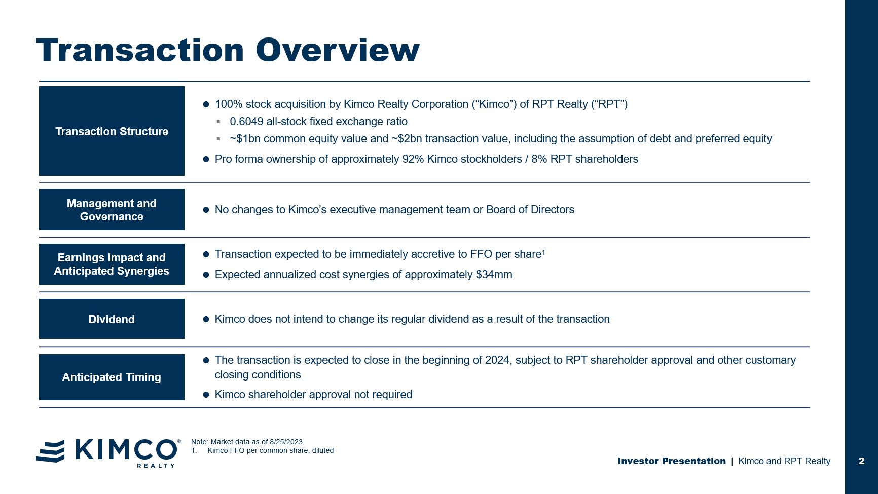 Safe Harbor  Forward Looking Statements  This communication contains certain “forward-looking” statements within the meaning of Section 27A of the Securities Act of 1933, as amended (the “Securities Act”), and Section 21E of the Securities Exchange Act of 1934, as amended. Kimco intends such forward-looking statements to be covered by the safe harbor provisions for forward-looking statements contained in the Private Securities Litigation Reform Act of 1995 and includes this statement for purposes of complying with the safe harbor provisions. Forward-looking statements, which are based on certain assumptions and describe Kimco’s future plans, strategies and expectations, are generally identifiable by use of the words “believe,” “expect,” “intend,” “commit,” “anticipate,” “estimate,” “project,” “will,” “target,” “plan”, “forecast” or similar expressions. Forward-looking statements regarding Kimco and RPT, include, but are not limited to, statements related to the anticipated acquisition of RPT and the anticipated timing and benefits thereof and other statements that are not historical facts. These forward-looking statements are based on each of the companies’ current plans, objectives, estimates, expectations and intentions and inherently involve significant risks and uncertainties. You should not rely on forward-looking statements since they involve known and unknown risks, uncertainties and other factors which, in some cases, are beyond Kimco’s and RPT’s control and could materially affect actual results, performances or achievements. Factors which may cause actual results to differ materially from current expectations include, but are not limited to, risks and uncertainties associated with: Kimco’s and RPT’s ability to complete the proposed transaction on the proposed terms or on the anticipated timeline, or at all, including risks and uncertainties related to securing the necessary RPT shareholder approval and satisfaction of other closing conditions to consummate the proposed transaction; the occurrence of any event, change or other circumstance that could give rise to the termination of the definitive transaction agreement relating to the proposed transaction; risks related to diverting the attention of Kimco and RPT management from ongoing business operations; failure to realize the expected benefits of the proposed transaction; significant transaction costs and/or unknown or inestimable liabilities; the risk of shareholder litigation in connection with the proposed transaction, including resulting expense or delay; the ability to successfully integrate the operations of Kimco and RPT following the closing of the transaction and the risk that such integration may be more difficult, time-consuming or costly than expected; risks related to future opportunities and plans for the combined company, including the uncertainty of expected future financial performance and results of the combined company following completion of the proposed transaction; effects relating to the announcement of the proposed transaction or any further announcements or the consummation of the proposed transaction on the market price of Kimco’s common stock or RPT’s common shares or on each company’s respective relationships with tenants, employees and third-parties; the ability to attract, retain and motivate key personnel; the possibility that, if Kimco does not achieve the perceived benefits of the proposed transaction as rapidly or to the extent anticipated by financial analysts or investors, the market price of Kimco’s common stock could decline; general adverse economic and local real estate conditions; the impact of competition; the inability of major tenants to continue paying their rent obligations due to bankruptcy, insolvency or a general downturn in their business; the reduction in income in the event of multiple lease terminations by tenants or a failure of multiple tenants to occupy their premises in a shopping center; the potential impact of e-commerce and other changes in consumer buying practices, and changing trends in the retail industry and perceptions by retailers or shoppers, including safety and convenience; the availability of suitable acquisition, disposition, development and redevelopment opportunities, the costs associated with purchasing and maintaining assets and risks related to acquisitions not performing in accordance with our expectations; the ability to raise capital by selling assets; disruptions and increases in operating costs due to inflation and supply chain issues; risks associated with the development of mixed-use commercial properties, including risks associated with the development, and ownership of non-retail real estate; changes in governmental laws and regulations, including, but not limited to changes in data privacy, environmental (including climate change), safety and health laws, and management’s ability to estimate the impact of such changes; valuation and risks related to joint venture and preferred equity investments and other investments; valuation of marketable securities and other investments, including the shares of Albertsons Companies, Inc. common stock held by Kimco; impairment charges; criminal cybersecurity attacks disruption, data loss or other security incidents and breaches; impact of natural disasters and weather and climate-related events; pandemics or other health crises, such as COVID-19; the ability to attract, retain and motivate key personnel; financing risks, such as the inability to obtain equity, debt or other sources of financing or refinancing on favorable terms or at all; the level and volatility of interest rates and management’s ability to estimate the impact thereof; changes in the dividend policy for Kimco’s common and preferred stock and Kimco’s ability to pay dividends at current levels; unanticipated changes in the intention or ability to prepay ce