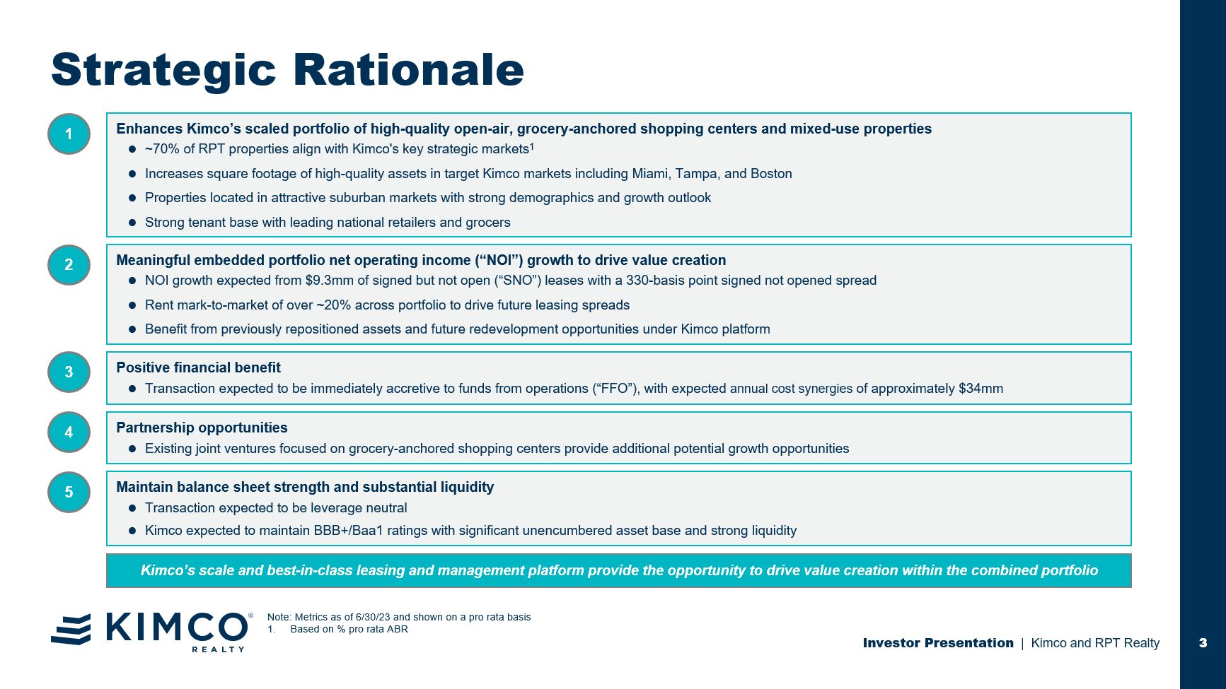 Transaction Overview  2  100% stock acquisition by Kimco Realty Corporation (“Kimco”) of RPT Realty (“RPT”)  0.6049 all-stock fixed exchange ratio  ~$1bn common equity value and ~$2bn transaction value, including the assumption of debt and preferred equity  Pro forma ownership of approximately 92% Kimco stockholders / 8% RPT shareholders  No changes to Kimco’s executive management team or Board of Directors  Transaction expected to be immediately accretive to FFO per share1  Expected annualized cost synergies of approximately $34mm   Kimco does not intend to change its regular dividend as a result of the transaction  The transaction is expected to close in the beginning of 2024, subject to RPT shareholder approval and other customary closing conditions  Kimco shareholder approval not required  Investor Presentation | Kimco and RPT Realty  Transaction Structure  Management and Governance  Earnings Impact and Anticipated Synergies  Dividend  Anticipated Timing  Note: Market data as of 8/25/2023  Kimco FFO per common share, diluted