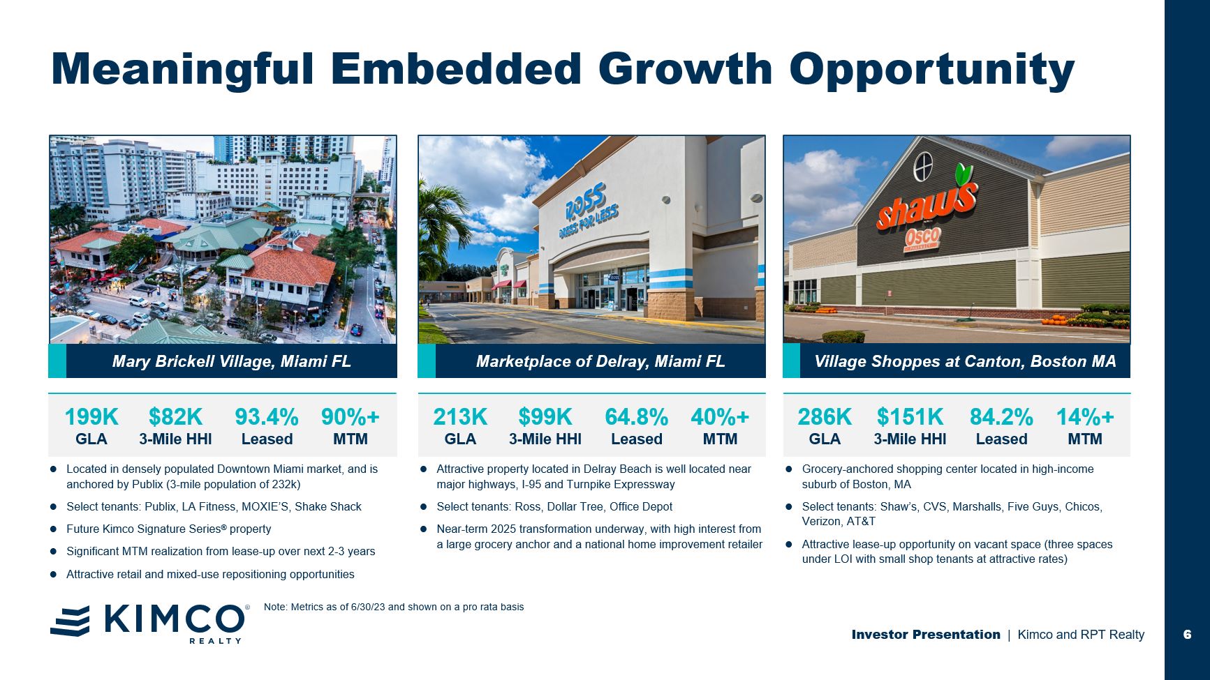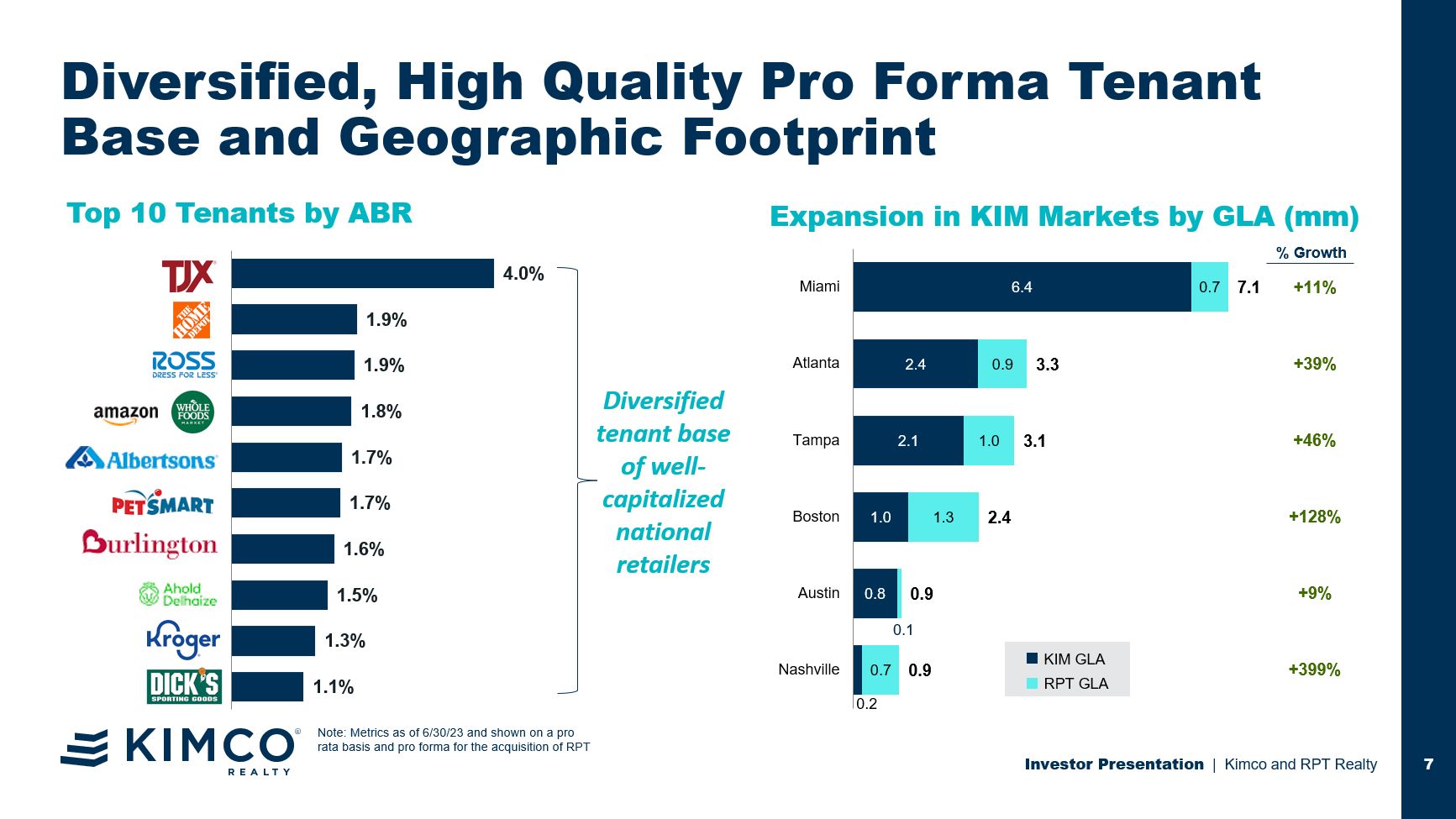 Meaningful Embedded Growth Opportunity  6  Investor Presentation | Kimco and RPT Realty  Mary Brickell Village, Miami FL  199KGLA  $82K3-Mile HHI  93.4%Leased  90%+MTM  Located in densely populated Downtown Miami market, and is anchored by Publix (3-mile population of 232k)  Select tenants: Publix, LA Fitness, MOXIE’S, Shake Shack  Future Kimco Signature Series® property   Significant MTM realization from lease-up over next 2-3 years  Attractive retail and mixed-use repositioning opportunities  Marketplace of Delray, Miami FL  213KGLA  $99K3-Mile HHI  64.8%Leased  40%+MTM  Attractive property located in Delray Beach is well located near major highways, I-95 and Turnpike Expressway  Select tenants: Ross, Dollar Tree, Office Depot   Near-term 2025 transformation underway, with high interest from a large grocery anchor and a national home improvement retailer  Village Shoppes at Canton, Boston MA  286KGLA  $151K3-Mile HHI  84.2%Leased  14%+MTM  Grocery-anchored shopping center located in high-income suburb of Boston, MA  Select tenants: Shaw’s, CVS, Marshalls, Five Guys, Chicos, Verizon, AT&T   Attractive lease-up opportunity on vacant space (three spaces under LOI with small shop tenants at attractive rates)   Note: Metrics as of 6/30/23 and shown on a pro rata basis