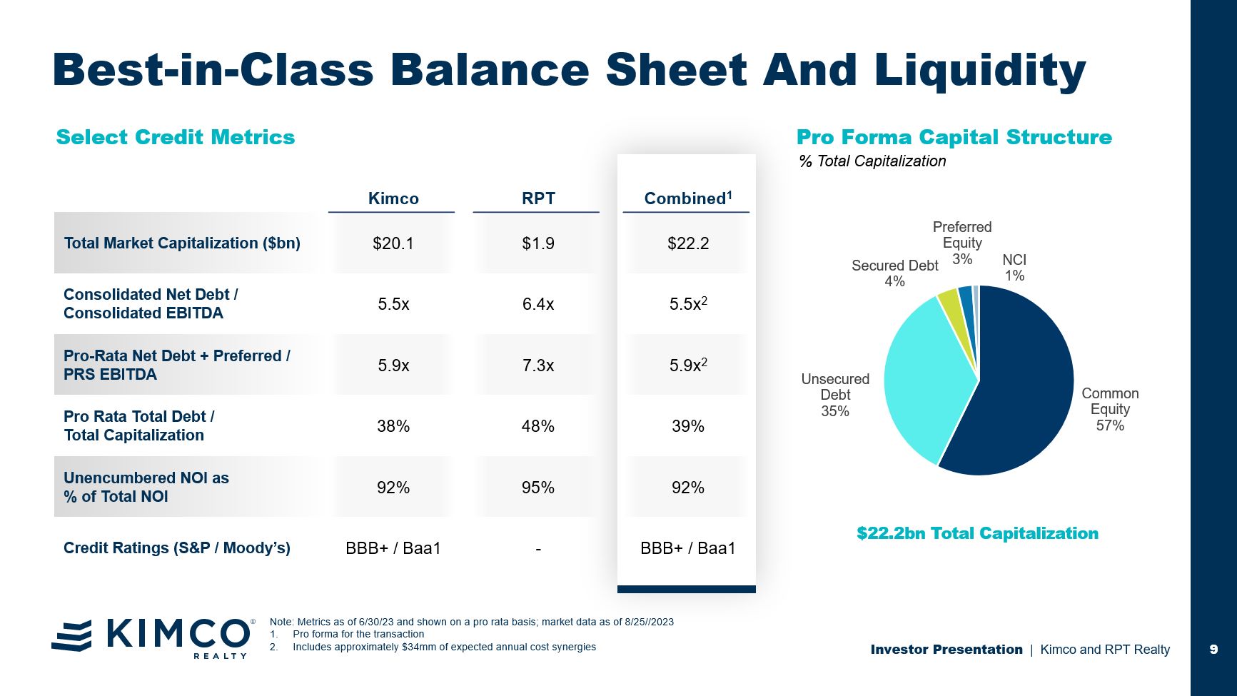 Accelerates Earnings Profile Over Time  8  Investor Presentation | Kimco and RPT Realty  Note: Metrics as of 6/30/23 and shown on a pro rata basis   Cost Synergies  Expected annual cost synergies of approximately $34mm  Same-Property NOI Growth  Over $9mm of signed but not open leases  Opportunity to increase portfolio occupancy to KIM levels  Capture substantial mark-to-market, estimated to be over ~20%  Redevelopment  Mary Brickell Village: Near-term remerchandising and long-term vertical densification opportunities  Additional redevelopment and development opportunities  Growth in Strategic Ventures  Opportunity to expand relationship with GIC and other joint venture partners across shopping center and net lease strategies  Proven Platform Benefits  Established playbook of ancillary revenue programs ranging from specialty leasing to energy services   Best-in-class retailer partnerships  Property operations team with expertise in purchasing, tenant coordination and security  Sector ESG Leader