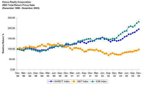 PROXY This Proxy is Solicited on Behalf of the Board of Directors The undersigned hereby appoints Milton Cooper, Michael J. Flynn and Bruce Kauderer as Proxies, each with the power to appoint his substitute, and hereby authorizes them to represent and to vote, as designated on the reverse side, all of the shares of Common Stock of Kimco Realty Corporation held of record by the undersigned on March 22, 2004, at the Annual Meeting of Stockholders to be held on May 20, 2004, or any adjournment(s) or postponement(s) thereof. The undersigned hereby acknowledges receipt of the Notice of the Annual Meeting of Stockholders and the accompanying Proxy Statement. The Board of Directors recommends a vote (1) FOR all of the nominees for director, a vote (2) FOR the recommendation by the Board of Directors that the Company's Equity Participation Plan be amended so that the Executive Compensation Committee has the authority to grant up to 15% of the shares of Common Stock available for future grant under the Equity Participation Plan as grants of restricted shares of Common Stock and (3) AGAINST the stockholder proposal to separate Chairman and Chief Executive Officer positions. To vote FOR all of the nominees for director, FOR the approval of the recommendation by the Board of Directors to amend the Company's Equity Participation Plan and AGAINST the stockholder proposal, just sign and date the reverse side. No boxes need to be checked. This