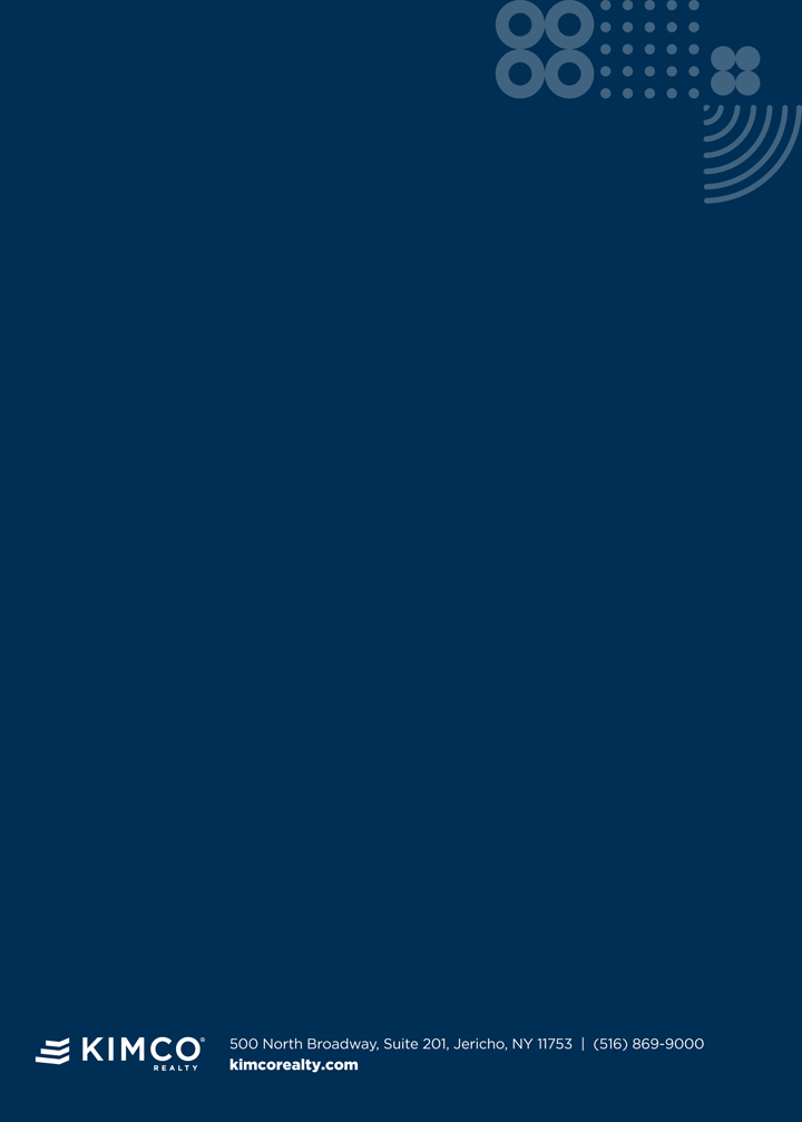 Kimco Realty® (NYSE: KIM) is a real estate investment trust (REIT) headquartered in Jericho, N.Y. that is North America’s largest publicly traded owner and operator of open-air, grocery-anchored shopping centers, and a growing portfolio of mixed-use assets. The Company’s portfolio is primarily concentrated in the first-ring suburbs of the top major metropolitan markets, including those in high-barrier-to-entry coastal markets and rapidly expanding Sun Belt cities, with a tenant mix focused on essential, necessity-based goods and services that drive multiple shopping trips per week. Kimco Realty is also committed to leadership in environmental, social and governance (ESG) issues and is a recognized industry leader in these areas. Publicly traded on the NYSE since 1991, and included in the S&P 500 Index, the Company has specialized in shopping center ownership, management, acquisitions, and value enhancing redevelopment activities for more than 60 years. As of December 31, 2022, the Company owned interests in 532 U.S. shopping centers and mixed-use assets comprising 91 million square feet (“SF”) of gross leasable space.
