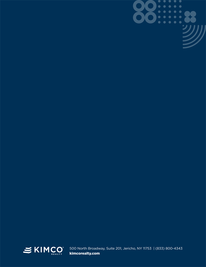 Kimco Realty® (NYSE: KIM) is a real estate investment trust (REIT) headquartered in Jericho, N.Y. that is a leading owner and operator of open-air, grocery-anchored shopping centers and mixed-use properties in the United States. The Company’s portfolio is strategically concentrated in the first-ring suburbs of the top major metropolitan markets, including those in high-barrier-to-entry coastal markets and rapidly expanding Sun Belt cities, with a tenant mix focused on essential, necessity-based goods and services that drive multiple shopping trips per week. Publicly traded on the NYSE since 1991 and included in the S&P 500 Index, the Company has specialized in shopping center ownership, management, acquisitions, and value enhancing redevelopment activities for more than 65 years. As of December 31, 2024, the company owned interests in 568 U.S. shopping centers and mixed-use assets comprising 101 million square feet (“SF”) of gross leasable space.