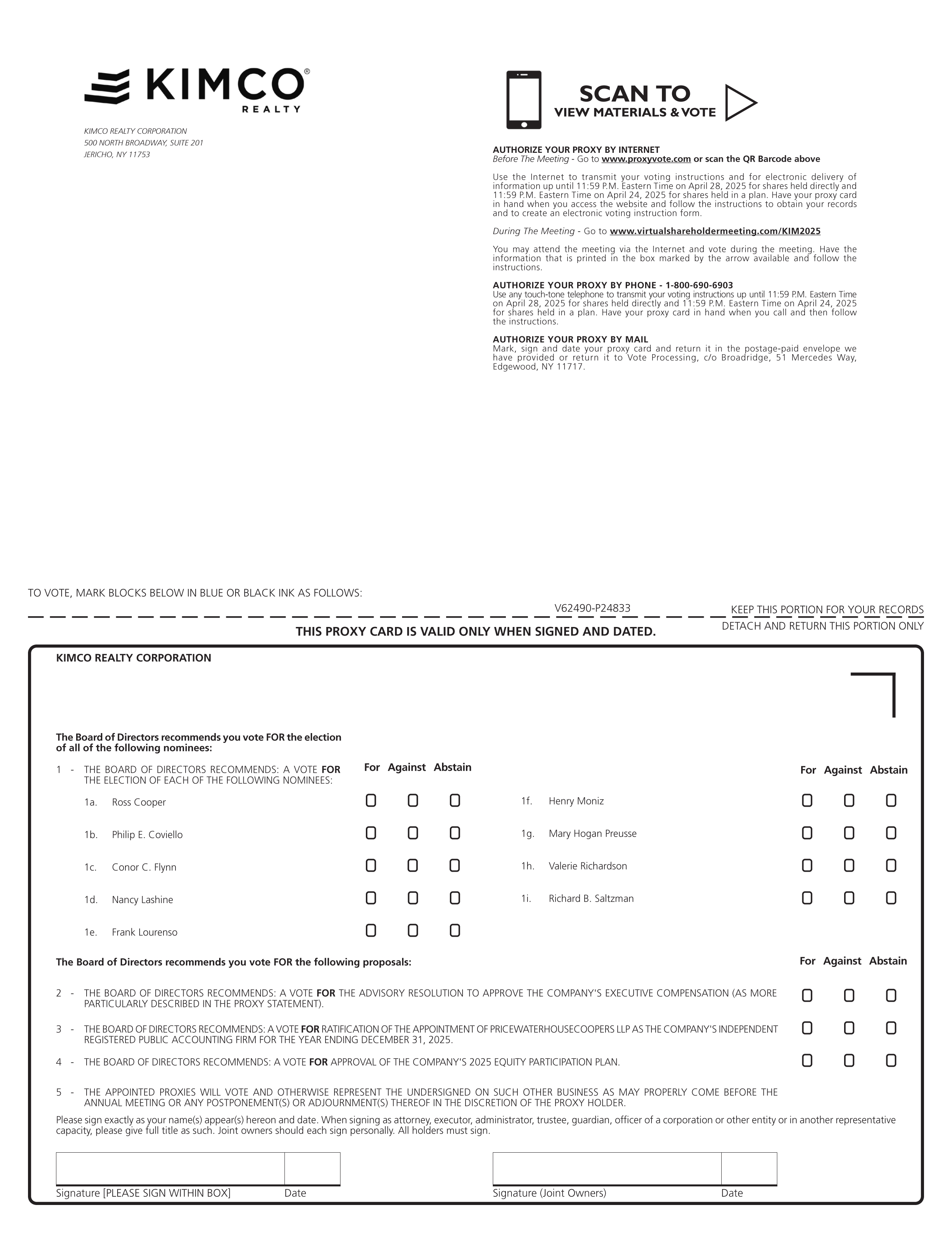 During this virtual meeting, you may ask questions, and you will be able to vote your shares electronically. You may also submit questions in advance by visiting www.virtualshareholdermeeting.com/KIM2025. The Company will respond to as many inquiries as time allows.