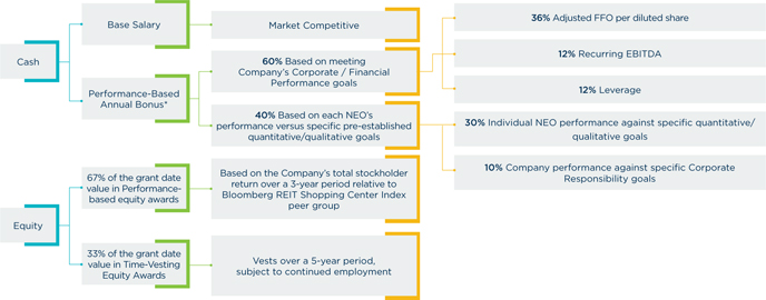 • Ended the year with over $2.2 billion of immediate liquidity. • Reported Consolidated Net Debt-to-EBITDA* of 5.4x. • Achieved an “A-” credit rating from S&P Ratings and an “A3” rating from Moody’s Ratings. • Repurchased 6.1 million shares of common stock during the year at a weighted average price of $19.79 per share. | • Leased over 12 million square feet across the nearly 2,000 leases signed during the year. • Grew pro-rata portfolio occupancy to 96.4% at the end of the year, matching the Company’s all-time high. • Ended the year with pro-rata leased occupancy for anchor spaces at 97.9%, and pro-rata small shop occupancy at an all-time high of 92.7%. • Expanded leased-to-economic leased occupancy spread to 390 basis points, representing $73 million of annual base rent (“ABR”) for near-term rent commencements from signed leases. | |||