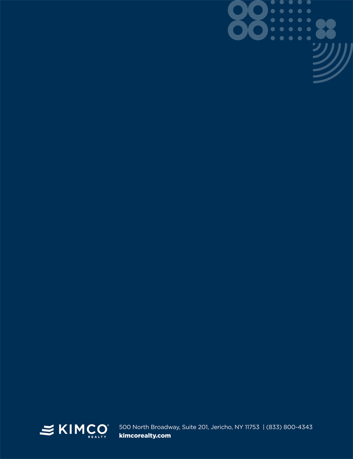 Kimco Realty® (NYSE: KIM) is a real estate investment trust (REIT) and leading owner and operator of high-quality, open-air, grocery-anchored shopping centers and mixed-use properties in the United States. The Company’s portfolio is strategically concentrated in the first-ring suburbs of the top major metropolitan markets, including high-barrier-to-entry coastal markets and Sun Belt cities. Its tenant mix is focused on essential, necessity-based goods and services that drive multiple shopping trips per week. Publicly traded on the New York Stock Exchange (“NYSE”) since 1991 and included in the S&P 500 Index, the Company has specialized in shopping center ownership, management, acquisitions, and value-enhancing redevelopment activities for more than 65 years. With a proven commitment to corporate responsibility, Kimco Realty is a recognized industry leader in this area. As of December 31, 2025, the Company owned interests in 565 U.S. shopping centers and mixed-use assets comprising 100 million square feet of gross leasable area.